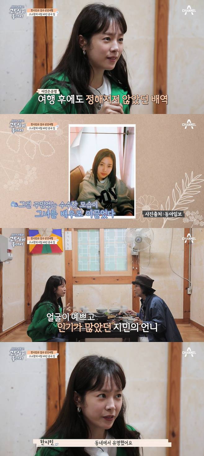 이날 고두심과 한지민은 경주 여행을 떠나 맛집을 찾는가 하면 이곳저곳을 둘러봤다. 어느 콩국 맛집도 방문해 오손도손 이야기를 나눈 두 사람. 고두심은 한지민에게 배우를 시작하게 된 계기를 묻자 한지민은 "끼도 없고 수줍었다. 근데 이상하게 자꾸 제가 (오디션에서 합격이) 되더라. 되고자 하는 욕심이 별로 없었다. 하라고 하니까 했는데 긴장을 안한 것처럼 보였던 것 같다"라고 이야기했다.