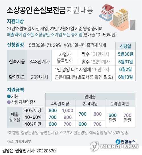 (서울=연합뉴스) 원형민 기자 = 신종 코로나바이러스 감염증(코로나19) 방역 조치로 피해를 입은 소상공인·자영업자 371만명은 30일 오후부터 최대 1천만원의 손실보전금을 순차적으로 지급 받을 수 있다.