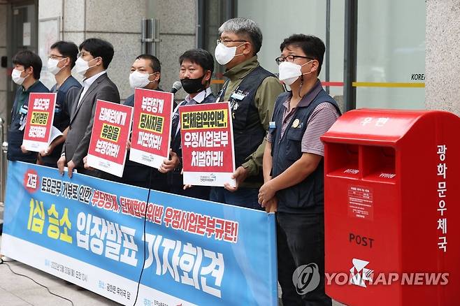 (서울=연합뉴스) 신현우 수습기자 = 공공운수노조 전국민주우체국본부 조합원들이 30일 오전 서울 종로구 광화문 우체국 앞에서 토요 근무 거부로 인한 부당징계 1심 승소에 대한 입장을 발표하고 있다. 2022.5.30