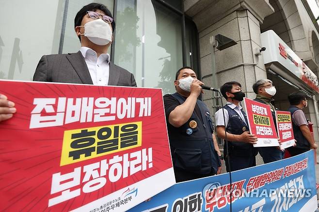 (서울=연합뉴스) 신현우 수습기자 = 30일 오전 서울 종로구 광화문 우체국 앞에서 열린 전국민주우체국본부 부당징계 1심 승소 입장발표 기자회견에서 부당징계 당사자인 남상명 조합원이 발언하고 있다. 2022.5.30
