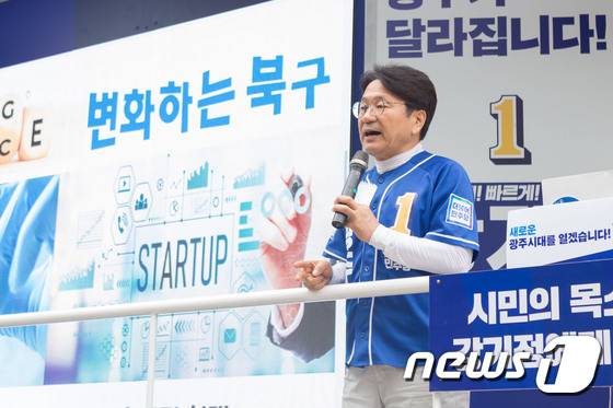 (광주=뉴스1) 박준배 기자 = 강기정 더불어민주당 광주시장 후보가 30일 광주 북구 청소년문화의집 앞에서 마지막 ‘정책소풍’을 열고 있다.(강추캠프 제공)2022.5.30/뉴스1