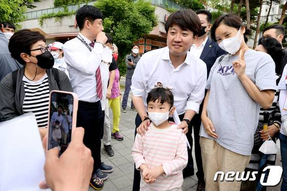 (수원=뉴스1) 국회사진취재단 = 이준석 국민의힘 대표가 30일 오후 경기도 수원시 영통구 경기도청 신청사 앞에서 열린 경기 남부권 기초단체장 후보 공약 실천 약속 기자회견을 마치고 지지자들과 기념 촬영을 하고 있다. 2022.5.30/뉴스1