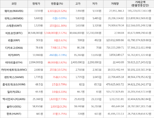 또한, 스테픈(11.36%, 1,520원), 디카르고(11.17%, 78.6원), 카이버네트워크(10.52%, 2,680원), 엑시인피니티(7.73%, 25,360원), 질리카(6.33%, 65.5원), 헌트(5.75%, 681원), 샌드박스(4.52%, 1,735원), 이더리움(3.82%, 2,394,000원), 룸네트워크(3.79%, 68.5원), 솔라나(3.2%, 58,950원), 리플(1.62%, 503원)이 상승세를 나타냈다.