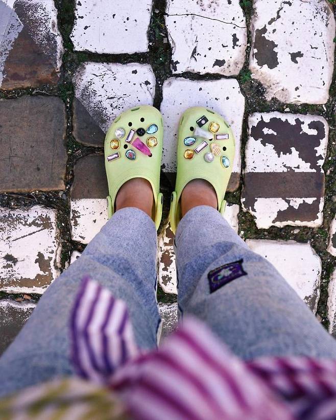 크록스의 최대 장점 중 하나인 지비츠를 잘 활용한다면 다양하게 멋진 룩을 연출할 수 있다. 인플루언서 레베카 웩슬러는 크리스탈 보석 스타일의 지비츠를 선택했다. 힙한 셔츠와 데님 팬츠, 헤어 스카프만으로도 충분히 멋지지만 보석 포인트 지비츠를 더해 트렌디하게 힙함을 인증했다. 한창인 여름 페스티벌 룩으로 시도해도 좋은 룩인 만큼 페스티벌에 갈 예정이라면 참고해보자.