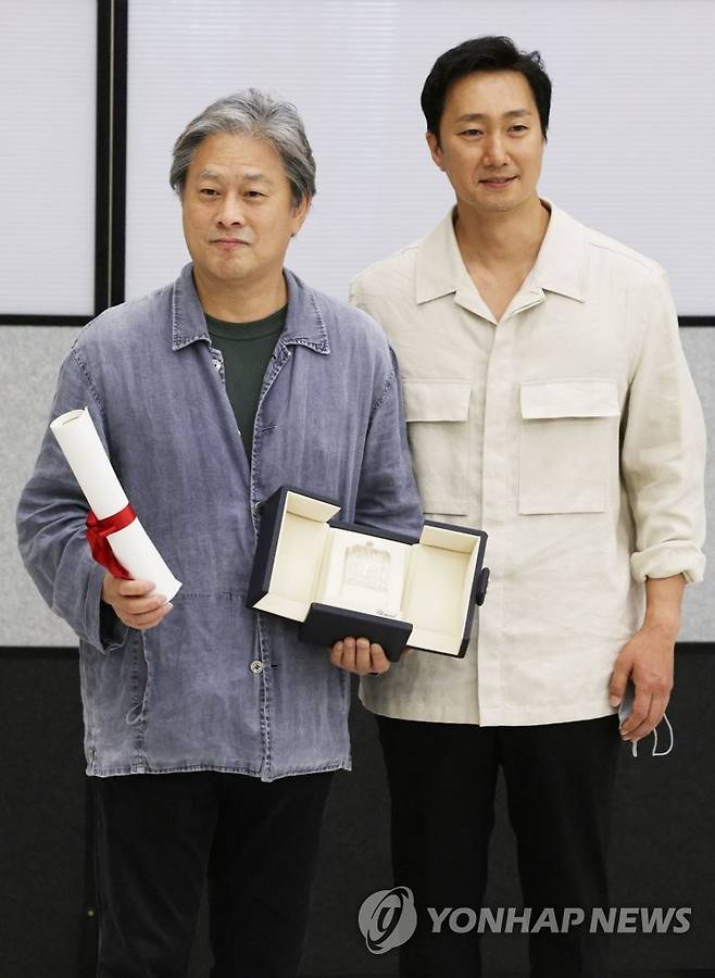 (영종도=연합뉴스) 한종찬 기자 = 칸국제영화제에서 감독상을 수상한 박찬욱 감독이 배우 박해일과 함께 30일 오후 인천국제공항을 통해 귀국, 트로피를 들고 포즈를 취하고 있다. 박찬욱 감독은 '헤어질 결심'으로 한국 감독으로는 두 번째이자 자신의 첫 번째 감독상 트로피를 거머쥐었다. 2022.5.30
