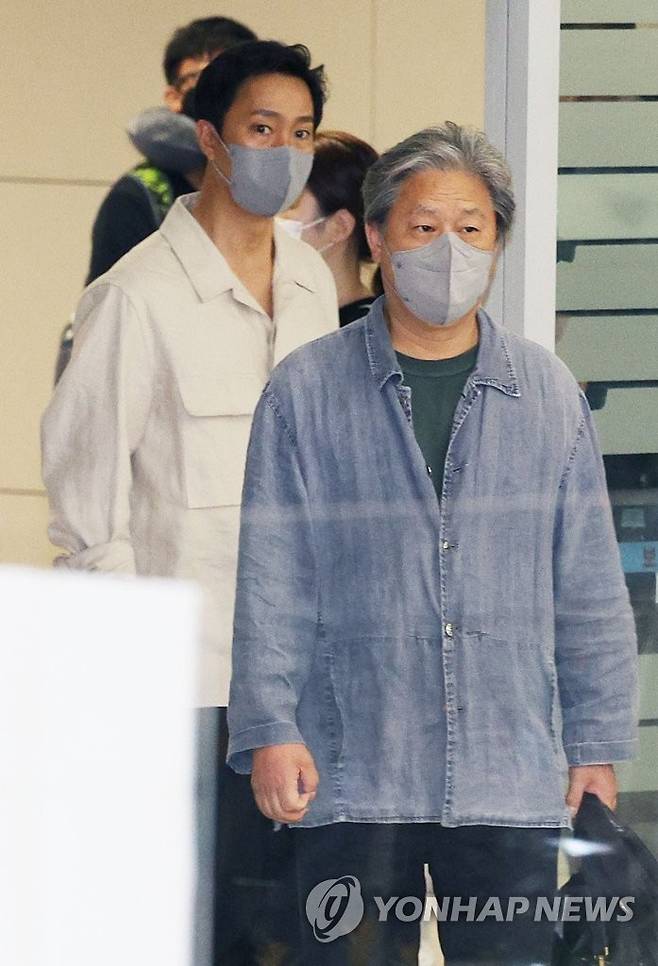 (영종도=연합뉴스) 한종찬 기자 = 칸국제영화제에서 감독상을 수상한 박찬욱 감독이 배우 박해일과 함께 30일 오후 인천국제공항을 통해 귀국하고 있다. 박찬욱 감독은 '헤어질 결심'으로 한국 감독으로는 두 번째이자 자신의 첫 번째 감독상 트로피를 거머쥐었다. 2022.5.30