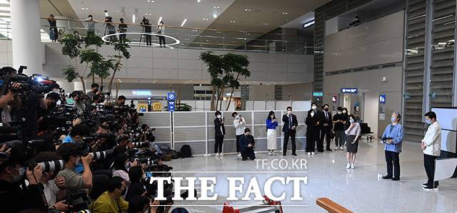 [더팩트ㅣ인천국제공항=남용희 기자] 영화 '헤어질 결심'으로 제75회 칸 국제영화제에서 감독상을 수상한 박찬욱 감독(왼쪽)과 배우 박해일이 30일 오후 인천국제공항을 통해 귀국하며 기념촬영을 하고 있다.