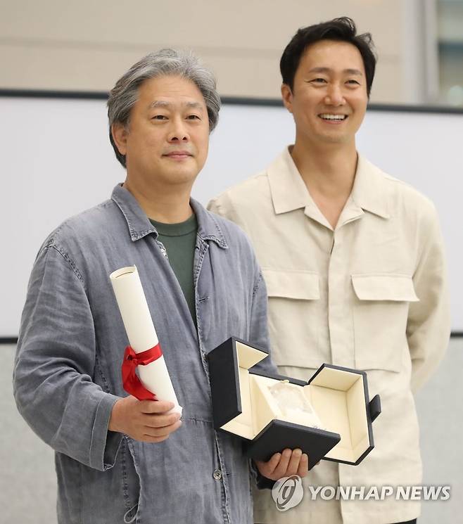 (서울=연합뉴스) 차지욱 수습기자 = 제75회 칸국제영화제에서 감독상을 받은 박찬욱 감독이 30일 오후 인천국제공항 제2여객터미널을 통해 입국한 후 트로피를 들고 있다. 오른쪽은 배우 박해일. 2022.5.30