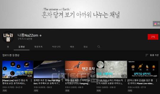 2위를 차지한 채널 '나쫌'은 현재 구독자 수 17만 명, 누적 조회 수 1600만 회를 보유하고 있다. 지난 4월 말 게재한 영상 '대박!! 오늘 아침 토성의 모습'이 큰 화제를 일으켜, 최근 한 달간 7만 명에 가까운 구독자를 새롭게 확보하며 급성장했다. 지난 한 주간은 구독자 9천 명이 늘어 5.4%의 성장률을 보였다.