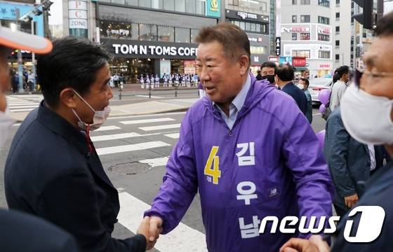 (제주=뉴스1) 고동명 기자 = 더불어민주당 탈당한 김우남 무소속 제주을 국회의원 후보가 30일 오후 제주시청에서 총력유세를 갖고 지지자들과 인사를 나누고 있다. 2022.5.30/뉴스1