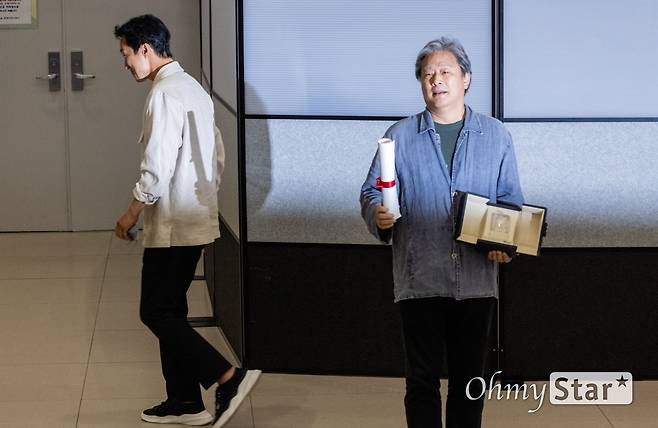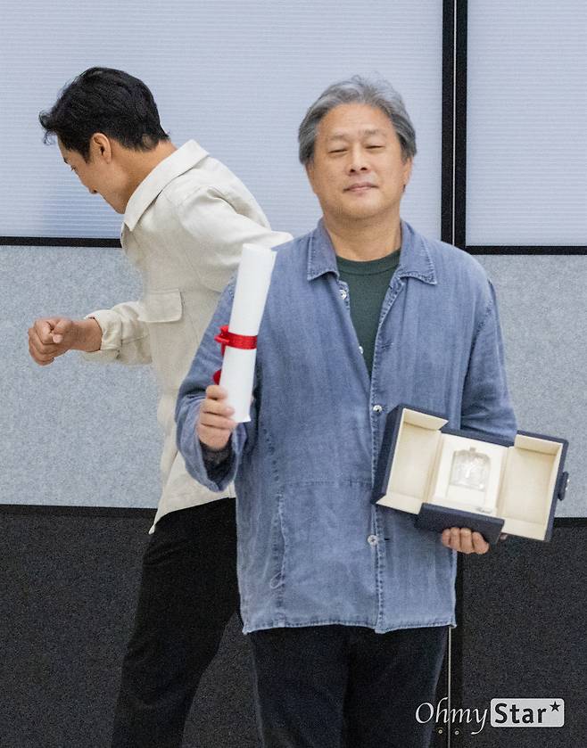 | ▲ 제75회 칸 영화제에서 영화<헤어질결심>으로 감독상을 받은 박찬욱 감독이 30일 오후 인천공항 제2터미널을 통해 입국해 수상한 트로피를 들고 있다. 뒤는 박 감독의 단독사진을 위해 자리를 피해주고 있는 배우 박해일. |
