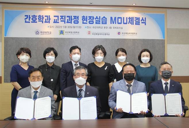 [창원=뉴시스] 홍정명 기자 = 경남 창원 소재 마산대학교 간호학과(학부장 남정자)는 30일 본관 국제회의실에서 지역 3개 중·고교와 ‘간호학과 교직과정 현장실습 협력 협약’을 체결했다.