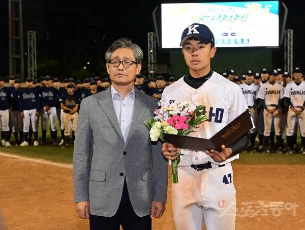 30일 서울 목동야구장에서 열린 ‘제76회 황금사자기 전국고교야구대회 겸 주말리그 왕중왕전’ 경남고와 청담고의 결승전 경기에서 우승을 차지한 경남고 조세익이 최다안타상을 수상해 양해영 대한야구소프트볼협회 부회장과 기념 촬영을 하고 있다.