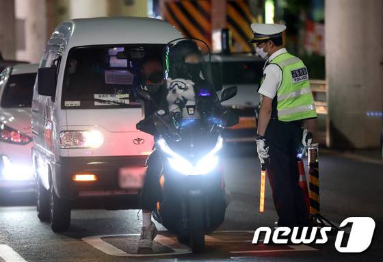 (서울=뉴스1) 장수영 기자 = 30일 서울 광진구 건대입구역 인근에서 경찰관이 차량 및 오토바이 등 이륜차 운전자를 대상으로 음주단속을 하고 있다. 경찰은 오토바이와 전동킥보드 등 이륜차에 대한 특별단속을 두달간 시행한다. 2022.5.30/뉴스1