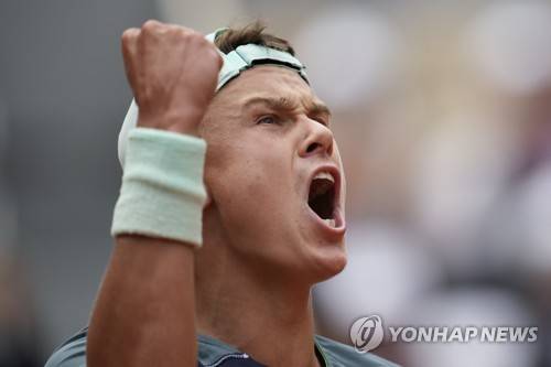 Denmark's Holger Rune clenches his fist after taking the first set against Greece's Stefanos Tsitsipas during their fourth round match at the French Open tennis tournament in Roland Garros stadium in Paris, France, Monday, May 30, 2022. (AP Photo/Christophe Ena)