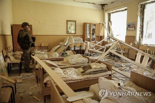 epa09986424 A self-proclaimed Donetsk People Republic investigator examines damage inside school 22 after shelling in downtown Donetsk, Ukraine, 30 May 2022. At least five people were killed and 16 injured after shelling hit two schools and a residential area in the city of Donetsk, authorities from the self-proclaimed Donetsk People's Republic (DPR) said on the day. On 24 February Russian troops had entered Ukrainian territory in what the Russian president declared a 'special military operation', resulting in fighting and destruction in the country and a humanitarian crisis. EPA/ALESSANDRO GUERRA