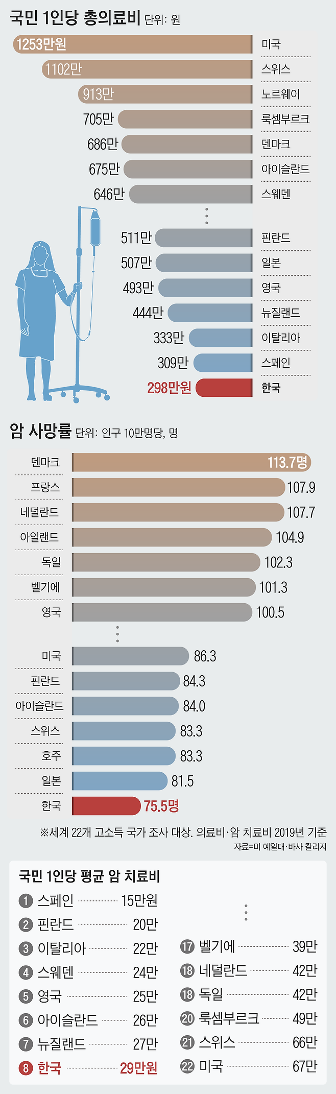 우선 한국은 암 사망률이 가장 낮았다. 암 사망률에 있어 한국은 10만명당 75.5명으로 22국 중 최저였다. 조사 대상국 전체 평균은 91.4명. 일본이 81.5명으로 2위, 호주와 스위스, 아이슬란드, 핀란드 등이 80명대였으며, 덴마크가 113.7명으로 가장 안 좋았다. 미국은 86.3명이었다. 1인당 총의료비도 한국이 298만원으로 가장 낮았다. 가장 높은 미국(1253만원), 스위스(1102만원)와 비교하면 3분의 1 정도였다.