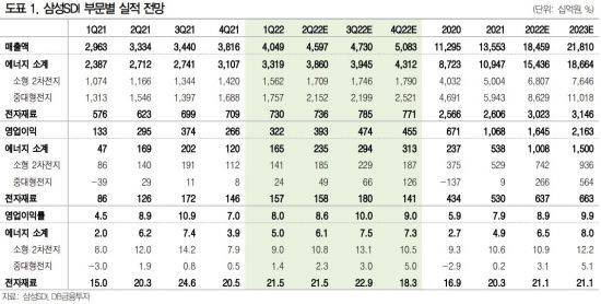 DB금융투자가 내다본 삼성SDI의 영업이익은 전년 동기 대비 33% 증가한 3930억원이다. 소형 전지와 자동차용 배터리, 에너지저장장치(ESS) 등에서 모두 매출이 늘며 대형 IT업체 중 가장 돋보일 것이라는 분석이다. 소형 전지는 전동공구용 시장 성장과 가격 인상으로 실적이 증가한다고 봤다. 자동차 전지는 젠5(Gen.5) 배터리를 중심으로 판매가 늘고, ESS는 미주 전력용 프로젝트 중심으로 공급이 확대될 것이라는 분석이다.