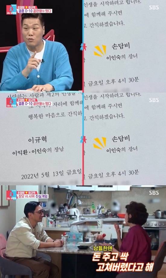 이에 손담비는 "맞다. 두 분 성함이 똑같다"며 고개를 끄덕였다. "청첩장을 뽑았는데 두 분 성함이 똑같아서 다들 오타라고 아시더라"라는 손담비의 말에 게스트로 출연한 이수지는 "천생연분이다"라며 신기함을 표했다.