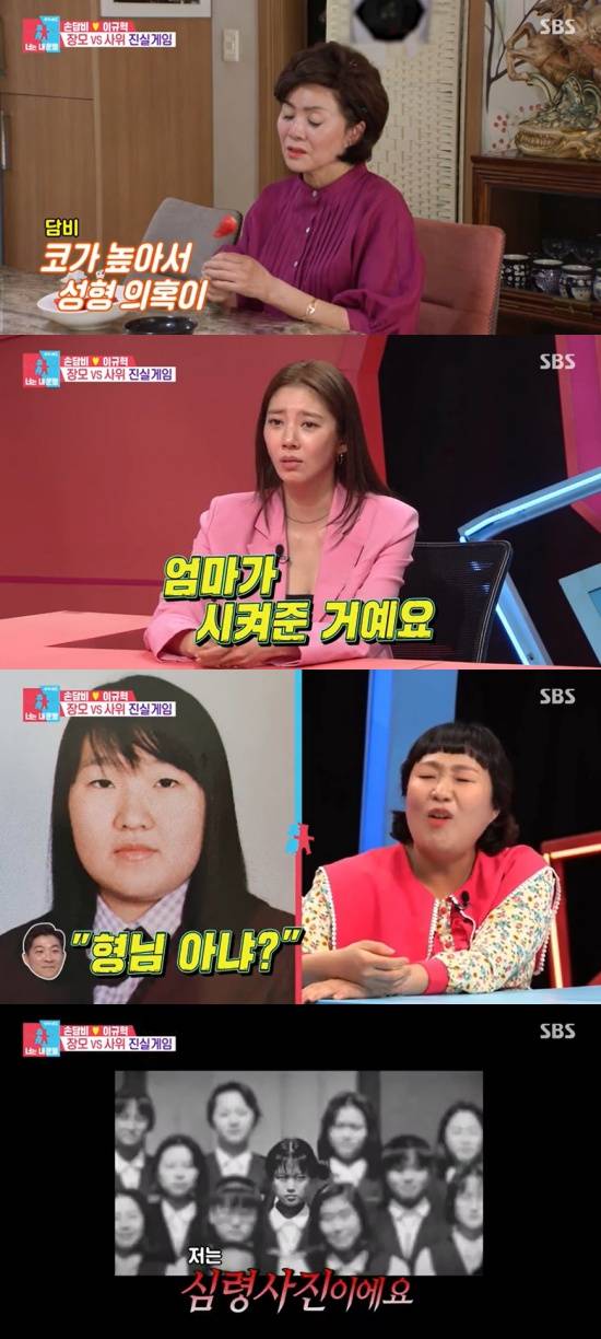 "다들 나한테 젊어졌다고 한다. 남들한테는 돈 많이 들여서 고쳤다고 한다. 요새는 다들 성형하지만 나는 그걸 싫어하는 편이다"라는 말로 시선을 모은 손담비의 어머니는 손담비의 성형을 고백해 웃음을 선사했다. "우리 딸은 코가 또 높아서 성형 의혹이 있다. 우리 딸은 성형 한 건 없고 눈은 찝었다"라는 어머니의 솔직함에 스튜디오 속 손담비는 질색하는 모습을 보였다. "왜 저러냐"는 손담비의 말을 들은 서장훈은 "눈 이야기는 예전에 손담비가 직접 하지 않았냐"고 물었다.