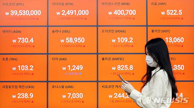 [서울=뉴시스] 김진아 기자 = 중국 상하이 봉쇄 해제 기대감에 비트코인이 3만1000달러선을 회복한 31일 오전 서울 서초구 빗썸 고객센터 전광판에 암호화폐 시세가 표시되고 있다. 2022.05.31. bluesoda@newsis.com