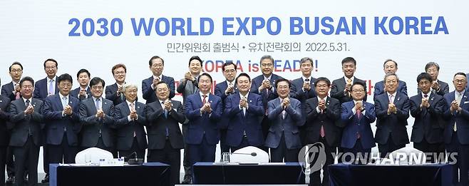 (부산=연합뉴스) 안정원 기자 = 윤석열 대통령이 31일 부산국제여객터미널 컨퍼런스홀에서 2030 부산엑스포 유치지원위 전략회의에 이어 열린 민간위 출범식에서 참석자들과 두손을 모으고 부산엑스포 유치를 기원하는 퍼포먼스를 하고 있다. 2022.5.31