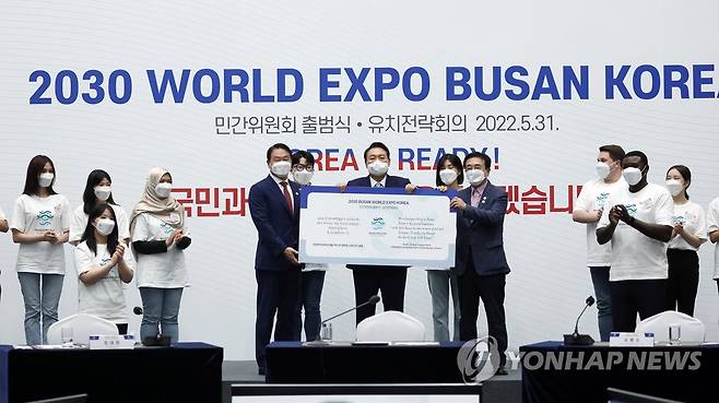 (부산=연합뉴스) 안정원 기자 = 윤석열 대통령이 31일 부산국제여객터미널 컨퍼런스홀에서 열린 2030 부산엑스포 유치지원위 전략회의에 이어 열린 민간위 출범식에서 유치기원보드를 들고 기념촬영을 하고 있다. 최태원 대한상공회의소 회장, 윤 대통령, 서병수 국회 유치지원특위 위원장. 2022.5.31