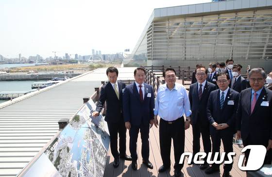 (부산=뉴스1) 안은나 기자 = 윤석열 대통령이 31일 부산 국제여객터미널에서 2030부산엑스포 부지를 둘러본 후 참석자들과 기념 촬영을 하고 있다. 왼쪽부터 김창균 해양수산부 항만국장, 최태원 대한상의 회장, 윤 대통령, 조승환 해양수산부 장관, 이창양 산업통상자원부 장관, 박진 외교부 장관. (대통령실사진기자단) 2022.5.31/뉴스1