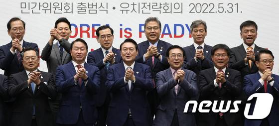 (부산=뉴스1) 안은나 기자 = 윤석열 대통령이 31일 부산항국제전시컨벤션센터에서 열린 2030부산엑스포 유치지원위 전략회의 및 민간위 출범식에서 최태원 대한상의 회장, 서병수 부산엑스포 유치지원특위 위원장을 비롯한 참석자들과 기념촬영을 하고 있다. 대통령실사진기자단 2022.5.31/뉴스1