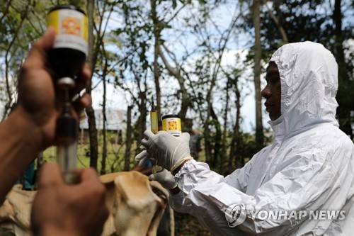 epa09987244 The Veterinary Team for Handling Foot and Mouth Diseases from Aceh Besar District conducts examinations and treatment for cows and buffaloes suspected of having an attack of the mouth and foot virus in the Blang Bintang area, Aceh Besar, Indonesia, 31 May 2022. The Aceh government's agricultural office intensifies the treatment and supervision of community livestock affected by the Mouth and Foot virus attack due to the increasing number of cases of the virus attack in Aceh. EPA/HOTLI SIMANJUNTAK