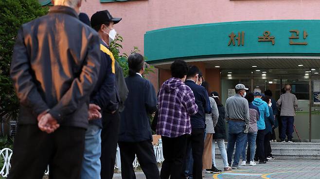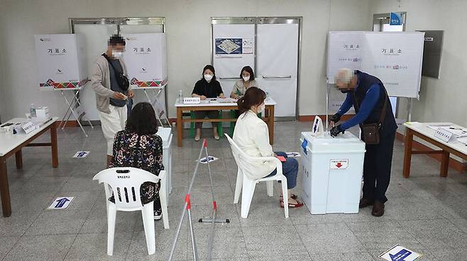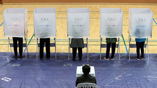 울산시 남구 신정4동 제5투표소가 마련된 동백초등학교 체육관에서 유권자들이 투표하고 있다.