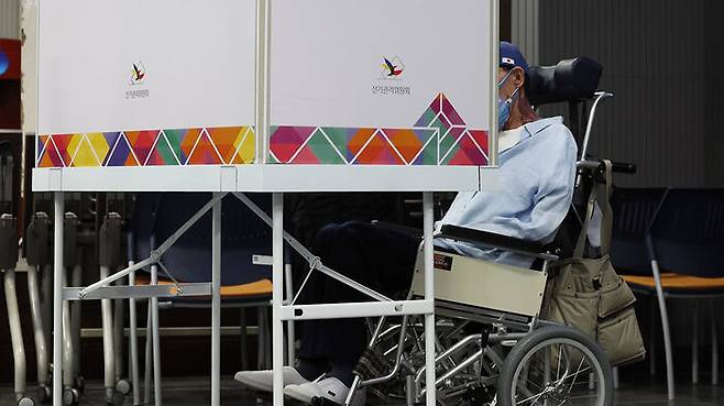 서울 용산구 중부기술교육원에 설치된 한남동 제3투표소에서 휠체어를 탄 유권자가 한 표를 행사하고 있다.