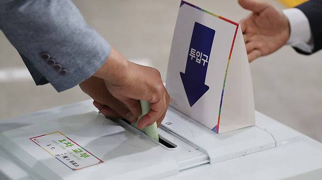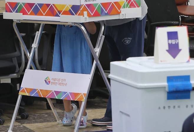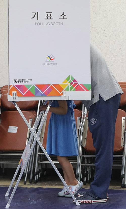 부산 사상구 괘법동 제3투표소에서 딸과 함께 온 남성이 소중한 한 표를 행사하고 있다.