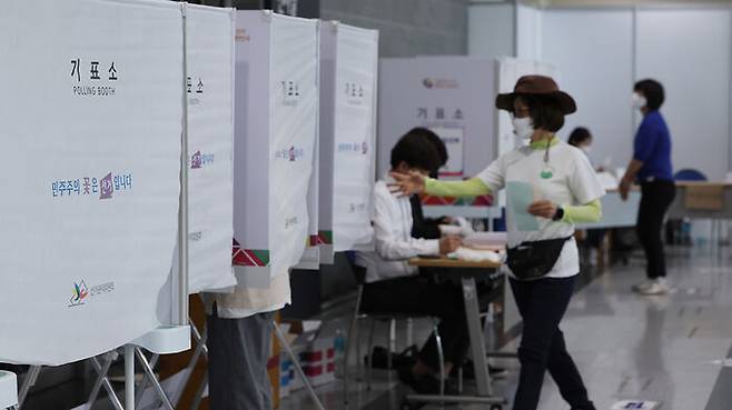 서울 영등포구 영등포아트홀에 마련된 당산제1동 제4투표소에서 유권자들이 투표를 하고 있다.