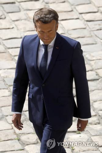 epa09989749 French President Emmanuel Macron attends a tribute ceremony for late Francoise Rudetzki, former President of French association SOS Attentats, a terrorism victims support group, at Les Invalides monument in Paris, France, 01 June 2022. Rudetzki died on 17 May at the age of 73. EPA/CHRISTOPHE PETIT TESSON