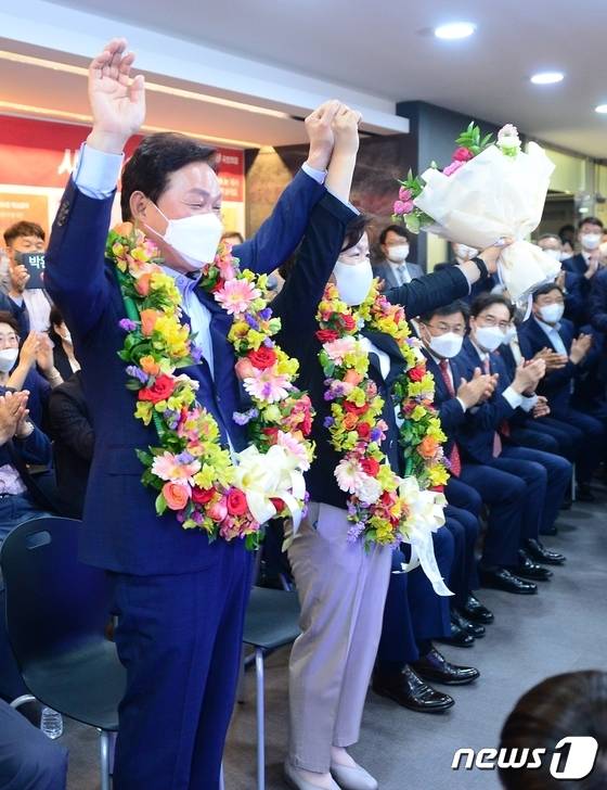 (창원=뉴스1) 강대한 기자 = 박완수 국민의힘 경남도지사 후보 내외가 1일 오후 창원시 선거대책본부 사무실에서 당선이 확실시 되자 꽃목걸이를 걸고 두 팔을 번쩍 들어올리고 있다.2022.6.1./뉴스1