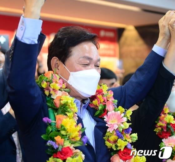 (창원=뉴스1) 강대한 기자 = 박완수 국민의힘 경남도지사 후보가 1일 오후 창원시 선거대책본부 사무실에서 당선이 확실시 되자 꽃목걸이를 걸고 두 팔을 번쩍 들어올리고 있다.2022.6.1./뉴스1