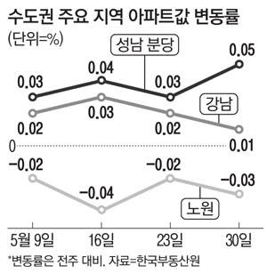 반면 수도권 1기 신도시 지역은 여전히 강세를 보였다. 성남시 분당구(0.03%→0.05%)와 일산이 포함된 고양시(0.06%→0.06%) 모두 이번주 상대적으로 아파트값 상승률이 높았다. 전문가들은 이번 지방선거에서 야권 후보가 경기도지사에 당선되긴 했지만 현재 야당이 장악하고 있는 국회와의 협력이 더 잘 될 수 있기 때문에 1기 신도시 정비사업 추진에는 큰 문제가 없을 것으로 보고 있다.