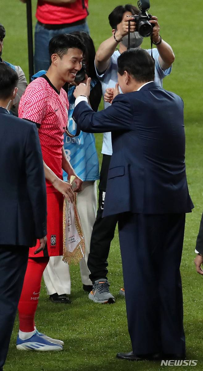 [서울=뉴시스] 전신 기자 = 윤석열 대통령이 2일 서울 마포구 서울월드컵경기장에서 열린 대한민국과 브라질 축구 국가대표팀 친선경기에 앞서 손흥민 선수에게 엄지를 치켜 세우고 있다. 2022.06.02. photo1006@newsis.com