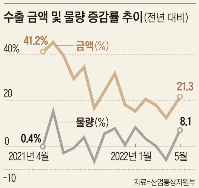 한국 경제가 과거와 달리 원자재 가격 급등에 맥을 못 추는 주요인으로 전문가들은 수출 성적표가 겉으로 보이는 것만큼 좋지 않다는 점을 첫손에 꼽는다. 우리나라 수출은 2020년 11월 이후 19개월 연속 증가(전년 대비)하고 있고, 작년 3월 이후로는 15개월 연속 해당 월의 역대 1위 수출액을 기록하고 있다. 올해 1~5월 수출액은 2926억달러(약 365조원)로 1~5월 기준 역대 최고치다.