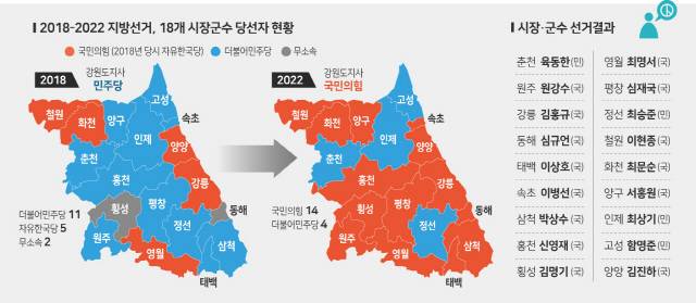 이로써 국민의힘은 강원도내 제1정당 입지를 굳건히 하게 됐다. 도지사를 포함한 다수 기초단체장 의석을 석권하며 4년만에 ‘탈환’에 성공한 것이다.