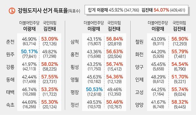 김 당선인은 강릉에서 가장 많은 표차를 벌렸다. 김 당선인은 강릉에서 5만8225표를 득표(득표율 58.02%), 이광재(4만2113표·득표율 41.97%)후보와의 표차를 1만6112표(득표율차 16.05%p) 벌렸다. 두 후보의 강원도 전체 표차(6만1695표)의 26.11%를 차지하는 비중으로, 1만표 이상 표차가 벌어진 곳은 전체 시군 중 강릉이 유일하다. 뒤를 이어 춘천에서의 표차가 8412표(득표율차 6.19%p)로 도내에서 두 번째로 컸다. 강릉은 윤석열 대통령의 ‘외가’, 춘천은 김진태 당선인이 국회의원을 지낸 곳이다.