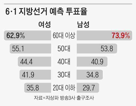 지난 3월 대선 출구조사의 예측 투표율과 비교해도 이번 지방선거는 연령대별 투표율 차이가 매우 컸다. 대선에선 국민의힘이 강세인 60대 이상(남성 89.4%, 여성 80.2%)과 더불어민주당이 강세인 40대(남성 70.1%, 여성 70.7%)의 차이가 이번보다 크지 않았다.