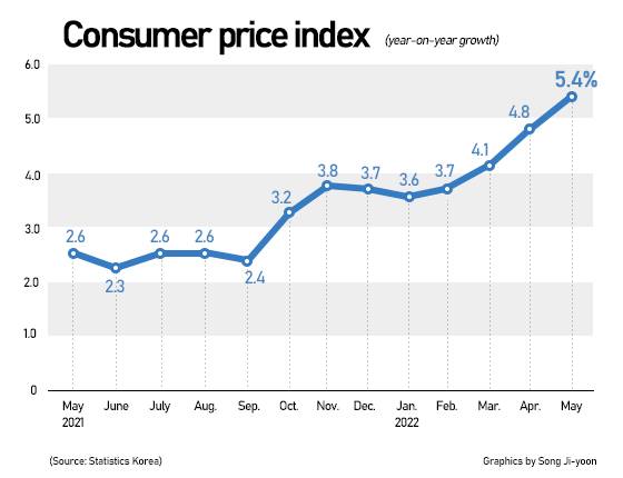 According to Statistics Korea on Friday, the country’s consumer price index (CPI) jumped 5.4 percent year over year in May, the highest since 5.6 percent in Aug. 2008.