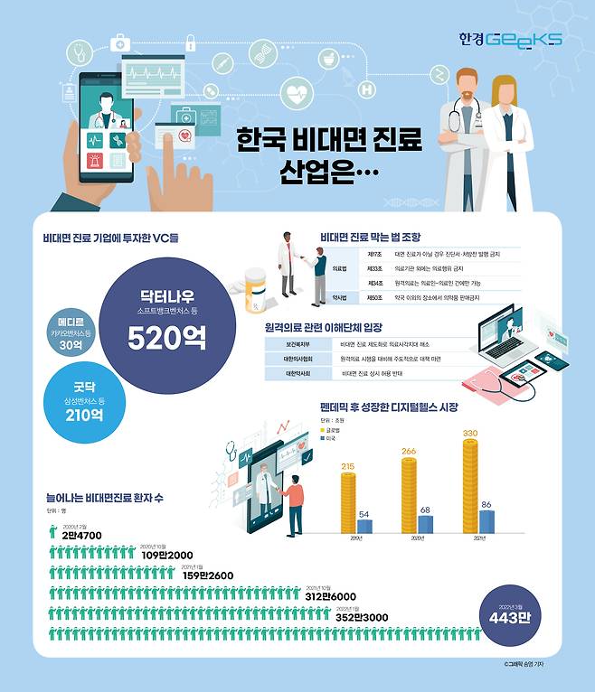 비대면 진료는 '불법'입니다. 코로나 19 팬데믹(대유행)이라는 특수한 상황 때문에 한시적으로 허용됐지만, 감영병 위기 대응 경보가 '심각'에서 '경계'로 낮춰지면 예전처럼 금지됩니다. 그럼에도 불구하고 벤처캐피털(VC)업계의 비대면 진료 투자 분위기는 뜨겁기만 합니다. 대기업의 관심도 높습니다. 새 정부가 육성 의지를 높이고 있지만 그렇다고 이것만 믿고 투자하기엔 리스크가 큽니다. 비대면 진료 분야에 베팅하는 투자자들은 어떤 속내를 가지고 기회를 모색하고 있을까요. 한경 긱스(Geeks)가 비대면 진료에 꽂힌 투자 전문가들을 만나봤습니다.