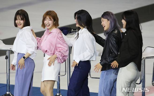 [서울=뉴시스] 권창회 기자 = 쇼트트랙 선수 박지윤(왼쪽부터), 노아름, 이유빈, 서휘민, 김아랑이 5일 오후 서울 양천구 목동 아이스링크장에서 열린 스케이팅 올스타 2022에서 세레모니를 하고 있다. 2022.06.05. kch0523@newsis.com