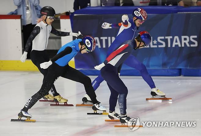곽윤기(왼쪽) 등 선수들이 '반대로 레이스' 이벤트 경기 결승선에 도달하며 스케이트 날을 내밀고 있다. 2022.6.5