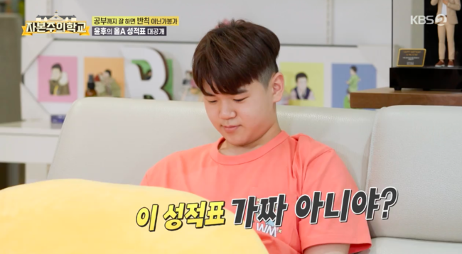 한편, 윤민수는 윤후에게 “얼마 전 중간고사 아니었냐 성적표 좀 보자”고 말했다. 윤후는 “핸드폰으로 볼 수 있다”며 말하자 이를 본 데프콘은 “가정통신문 아니냐”며 요즘 시대에 맞춘 시스템에 놀라워 했다. 윤후의 성적표를 본 윤민수는 “가짜 아니야? 어떻게 올 A를 받냐”며 믿을 수 없다는 표정을 지었다. 그러면서 “우리 집안에 어떻게 이런 일이 생길 수 있냐”며 뿌듯한 미소를 숨기지 못했다.