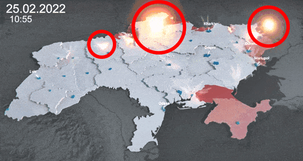 라이브UA맵 시각화 자료에는 또 러시아군의 전술 변화도 잘 드러났다. 러시아군은 침공 첫날 우크라이나 동·남·북 3면에서 일제히 공격을 개시했다. 동북부 하르키우, 중부 드니프로, 남부 오데사, 서부 르비우 인근에까지 동시다발적인 미사일 공격을 감행했다. 단기전을 목표로 수도 키이우를 향해 점령 범위를 넓혀가던 러시아군은 그러나 우크라이나군의 거센 저항에 밀려 전술을 수정했다.