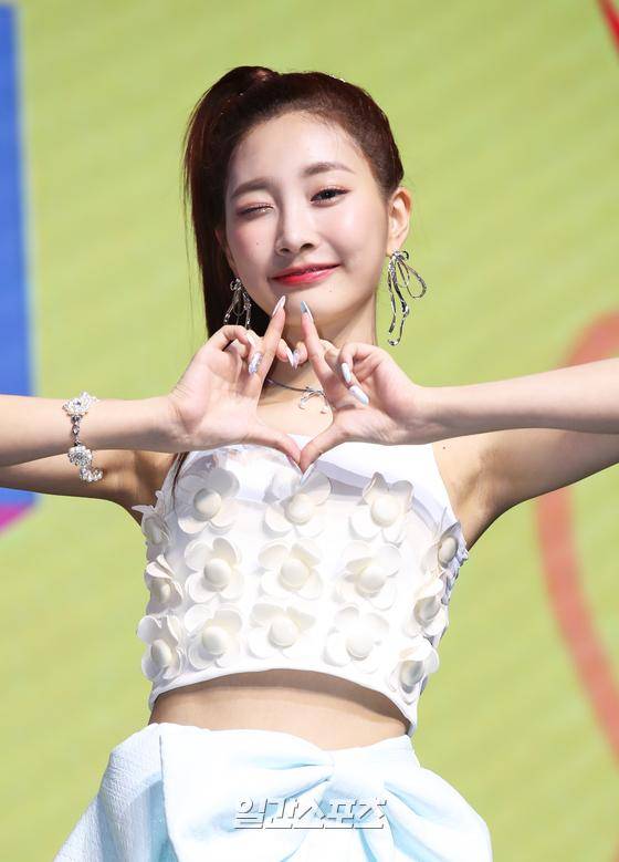 우아!(루시, 우연, 나나, 소라, 민서) 멤버 민서가 포토타임에서 포즈를 취하고 있다.